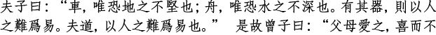 The Master said: “(People in) carriages only fear ground that is not firm; (those in) boats only fear water that is not deep. (Yet) having these vehicles makes people’s problems easier. (Likewise,) the Way makes people’s problems easier.”