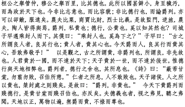 Duke Huan promoted Guan Zhong and Duke Mu promoted Boli (after) evaluating their virtue. Their (virtue) is the reason why such small and remote states, (governed by) such “worthless” people, nevertheless came to rule the world.10 Nowadays no one (seems to) evaluate intentions and ideas, but (only) manners and appearance, and no one evaluates virtue and behavior, but (they only) discuss rank and status. Meanwhile, (it is only virtue) that can make enemies retreat and distant (vassals) submit.