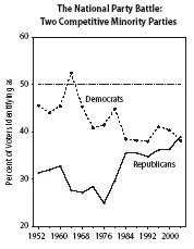 America’s power struggle is waged in a political system that does not have a majority party. Close national elections rest upon the nearly equal size of the two minority parties. Drawing upon a half century of public opinion polling, figure 1.1 tracks the American party battle in the national electorate. Excluding independents, it charts the percentage of American voters who classified themselves as Republicans or Democrats in presidential elections from 1952 through 2004.6