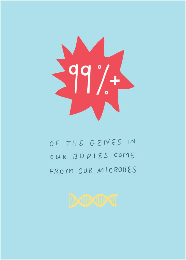 We’ve already learned that, in terms of sheer numbers of cells, the microbial cells in our bodies outnumber the human cells by up to ten to one. What happens if we measure by DNA? In that case, each of us of us has about twenty thousand human genes. But we’re carrying some two million to twenty million microbial genes. Which means that, genetically speaking, we’re at least 99 percent microbe.