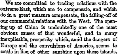 The finest proof of this muscular pudding lay in that vast new market which had been prised open by a short but fiery lesson in the reach of the British Empire and the inadvisability of trying to stem the inevitable march of free trade, even if it included opium.6