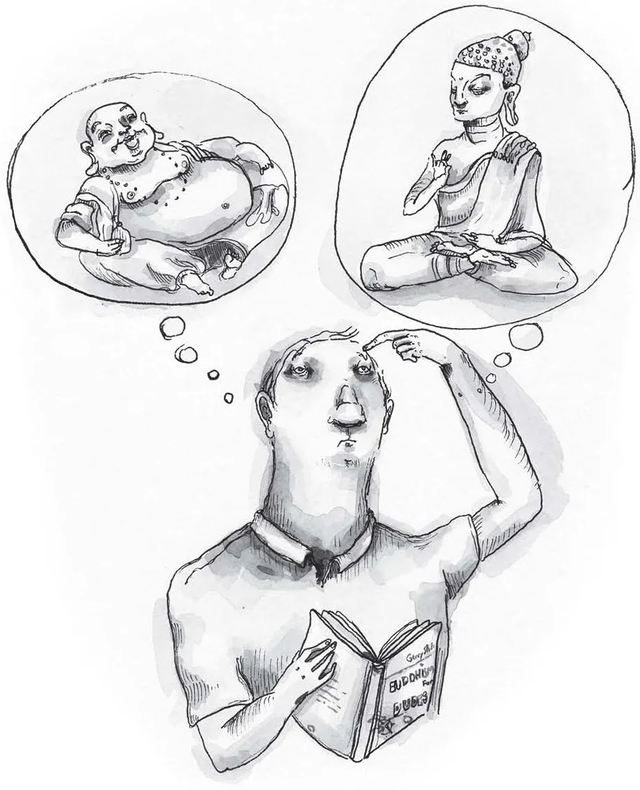 Take, for example, the image of the Buddha himself, or at least the image many Americans associate with the founder of this philosophy: until I went to Asia, I didnât know that the Buddha was not a fat guyâthe hairless bag-toting Santa Claus often seen in the front of Chinese restaurants wearing a shit-eating grin on his big, chubby face. That image is actually a Chinese god of happiness and contentment. Most images of the Buddha have fit, studlier bodies with a round head of curly hair tied in a topknot. But when it comes down to it, what sets the Buddha apart isnât his appearance; itâs what he taught.