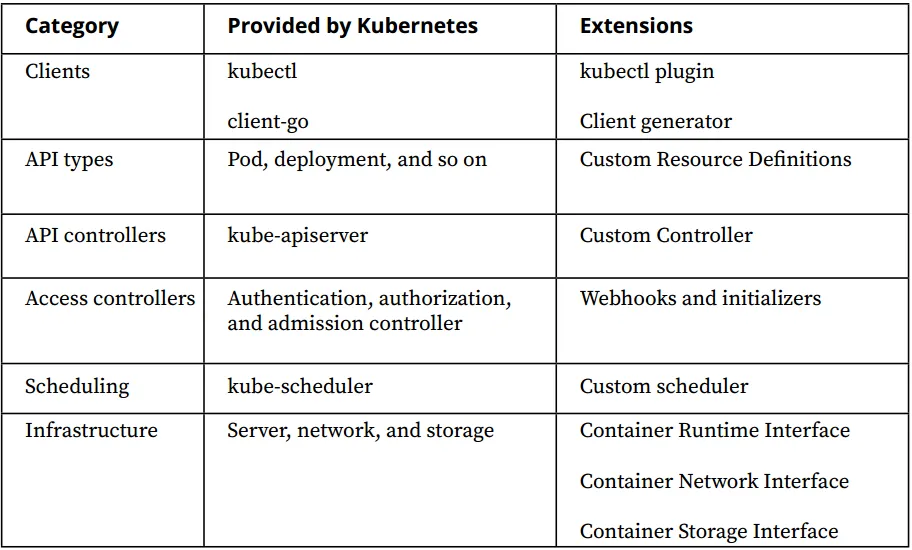 - Infrastructure: The infrastructure part of Kubernetes is standardized, regarding the server, network, and storage with the Container Runtime Interface (CRI), Container Network Interface (CNI), and Container Storage Interface (CSI). The implementation, of these interfaces provide ways of extending the infrastructure of the underlying Kubernetes clusters.