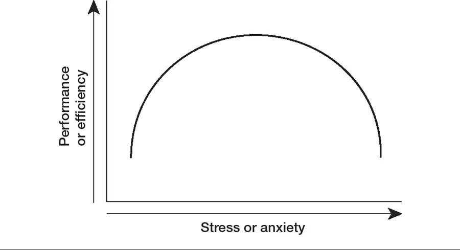 The best way to understand this mechanism is to go back [about] 100 years to the work of two Harvard researchers, Robert Yerkes and John Dodson. In 1908, these two demonstrated that efficiency increases when stress increases, but only up to a point; after that, performance falls off dramatically (see figure 1-1). We found that by taking the stress level up to the top of the bell curve and then effectively pulling the rug out from under it by turning to a quieting, rejuvenating activity, subjects could evoke the relaxation response, which effectively counteracts the negative effects of the stress hormones. Molecular studies have shown that the calming response releases little âpuffsâ of nitric oxide, which has been linked to the production of such neurotransmitters as endorphins and dopamine. These chemicals enhance general feelings of well-being. As the brain quiets down, another phenomenon that we call calm commotionâor a focused increase in activityâtakes place in the areas of the brain associated with attention, space-time concepts, and decision making.