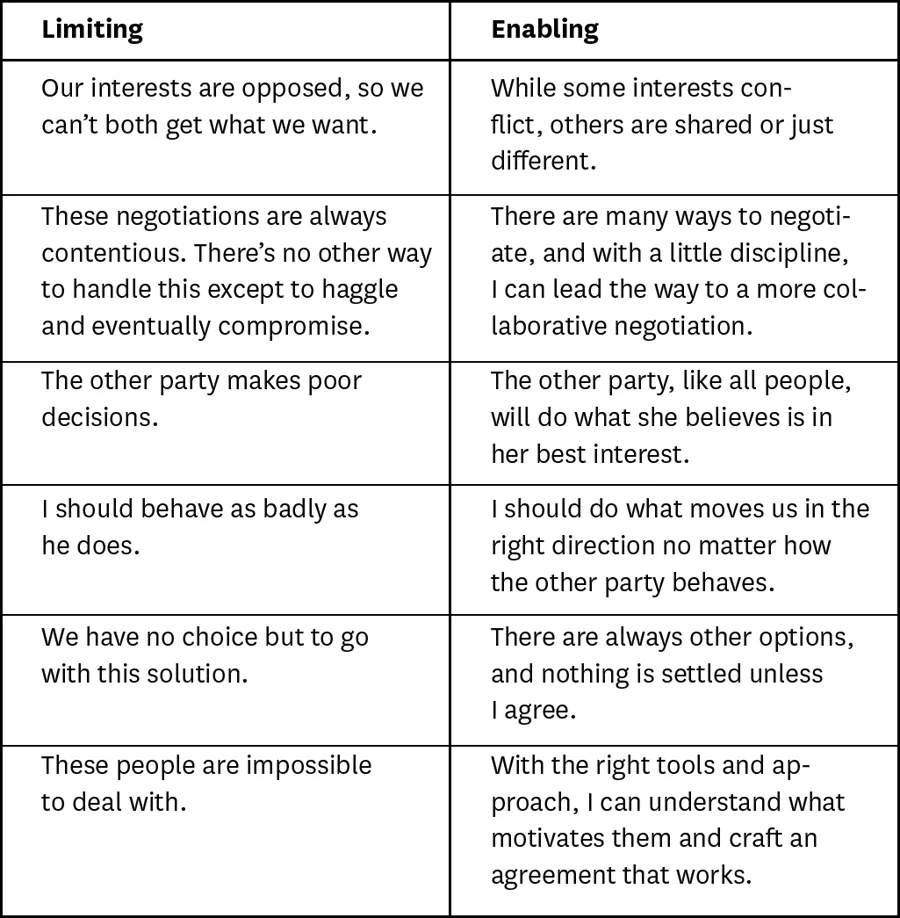 To address your negative ideas about how the negotiation will go, reframe them into âenablingâ assumptionsâones that support a more positive outcome. (If you arenât able to disprove myths about the other party, this approach can work for her as well.)