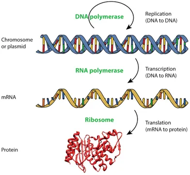 Use of this manual requires a little basic knowledge in chemistry and biochemistry. Such principles are well covered by many textbooks (see References), including the only textbook on the principles of synthetic biology published at the time of writing (Freemont and Kitney, 2012). The reader is encouraged to consult these textbooks for the structures of biological macromolecules and their functions such as base pairing and catalysis. Nevertheless, it is difficult to find updated practical information in three rapidly evolving fields central to our experimental design: codon bias, chromoproteins and antisense RNAs in E. coli. Before covering these three topics below, some basic aspects of molecular biology directly relevant to synthetic biology and our lab are introduced.