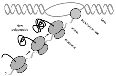 The particular type of RNA that encodes protein is called messenger RNA (mRNA). RNA synthesis from a DNA template is catalyzed by RNA polymerase and is termed transcription. Protein synthesis from an mRNA template is catalyzed by ribosomes and is called translation. In contrast to higher organisms where transcription is physically separated from translation, bacteria couple transcription and translation (Fig. 4).