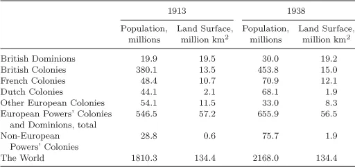 Table 2. Colonial Dependencies in 1913 and 1938: Populations and Land Surfaces.