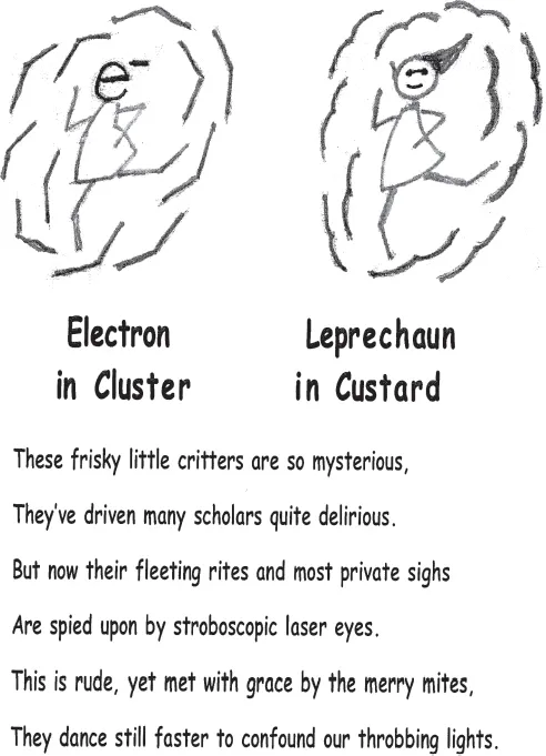 In November 1992, Ahmed visited Cambridge to deliver a joint Harvard–MIT physical chemistry seminar. As well as giving a scintillating talk on femtochemistry, he romped through visits with faculty, students, and postdocs, the day at Harvard before his talk and at MIT the day after. I had the opportunity to engage in a wide-ranging discussion with him for two hours in the morning and another four hours during and after dinner. Throughout, Ahmed was delightfully vivacious, both in describing his work and asking many searching questions. He was especially curious about a whimsical verse I had hung up near my desk (see Figure 1.2). I had composed it after a seminar given at Harvard in the early 1980s by Geraldine Kenney-Wallace. At Toronto, in 1974, she had set up an ultrafast laser that enabled her to elucidate the formation of solvated electrons. Back then, “ultrafast” meant picosecond. The format of my verse mimics that in a booklet of poems by Robert Williams Wood (1868–1955) titled How to Tell the Birds from the Flowers (1917). Wood was an outstanding physicist, celebrated for his work on spectroscopy, physical optics, infrared and ultraviolet photography, ultrasonics — and for his humorous enterprises. I had composed several poems using Wood’s format, which required coming up with two sketches with titles that are similar in looks and sound. Despite some effort, I had failed to concoct anything tractable for femtochemistry. Ahmed was gracious in accepting my apology. In turn, I noted that the words of the poem would apply to his femtochemistry, if the final line were changed to read: “They dance faster but cannot elude our throbbing lights.”