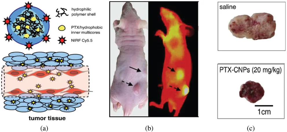Kwon and co-workers reported polymeric self-assembled nanoparticles based on hydrophobic biocompatible/biodegradable glycol chitosan (HGC).11,12 These particles were shown to circulate through the blood stream for up to three days and preferentially accumulated in tumors via enhanced permeability and retention (EPR) effect. These particles were loaded with paclitaxel for cancer chemotherapy. Additionally, the HGC nanoparticles were labeled with Cy5.5, which is a near infrared fluorescent dye, for imaging. These polymeric nanoparticles were used for simultaneous visualization and treatment in SCC7 tumors in vivo. Figure 1.1 shows the schematic diagram of the polymeric nanoparticles along with an example of excised tumor treated with saline and paclitaxel-loaded HGC nanoparticles (PTX-CNP).