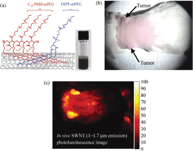 Dai and co-workers have studied the exposure of SWNTs to laser light excitation in the biological optical window, i.e. in the range of 700 nm to 900 nm wavelengths. This excitation wavelengths were could induce thermal ablation of cancer cells both in vitro as well as in vivo.19 They functionalized SWNTs by PEGylated phospholipids with non-toxic and long-circulating properties. In order to demonstrate in vivo measurements, 4T1 murine breast tumor cells were injected subcutaneously in 20 BALB/c mice right shoulders to obtain tumor-bearing mice. Five days after the inoculation, 10 mice were injected with 200 μL of a 2 μmol/L solution of SWNTs through intravenous tail injection. Figure 1.2(a) shows the schematic diagram of SWNTs with the coatings. These nanotubes were coated with a 50% DSPE-mPEG/50% C18-PMH-mPEG. The fluorescence of nanotubes was monitored in vivo for 48 hours using a 2DInGaAs detector. The other 10 mice remained untreated as controls. Three days after injection, all mice were irradiated with an 808 nm NIR laser for 5 minutes at 0.6 W/cm2 with a laser spot size of 4.4 cm2. The temperature was monitored continuously with thermal imaging. The images showed that the tumors on non-SWNT injected mice heated up very slowly and reached an average temperature of 43°C. However, the tumors of SWNTs injected mice heated up very fast and after 5 minutes of irradiation the temperature reached up to 52.9°C. All tumors in the control NIR radiation group without SWNTs injection did not show any sign of treatment, and all mice were considered as “non-survival” by the 36th day after thermal therapy. However, the tumors shrank in all SWNT injected and laser treated mice on average about two weeks after the treatment. All 10 mice in this group were considered survivors by ~6 months post-treatment without any tumor relapse.