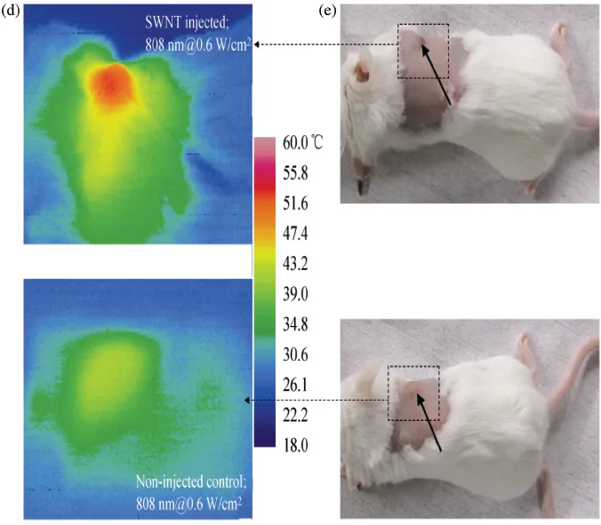Figures 1.2(b) and 1.2(c) depict optical imaging and SWNTs photo-luminescence imaging of BALB/c mice with breast tumors on both shoulders.Figure 2(d) depicts thermal imaging of an SWNT-injected mouse taken 4.5 minutes into NIR laser irradiation (top image) and a control mouse with the same irradiation (bottom image). Figure 1.2(e) shows the optical image of the BALB/c mouse injected with SWNTs (top image) and non-injected mouse (bottom image) immediately before NIR laser irradiation.