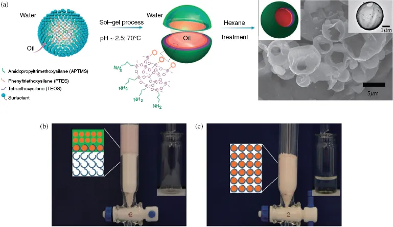 Figure 2. (a) SEM and inset TEM images of inorganic Janus hollow spheres. (b) The toluene–water emulsion was added to the chromatography stacked with Janus hollow spheres. (c) Water eluted while toluene was absorbed. Reprinted with permission from Ref. [10]. Copyright (2011) Royal Society of Chemistry.