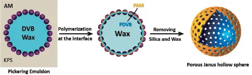 Pickering emulsion is a classic and effective strategy for preparing Janus particles using 3D interface as the protecting layer. We observed that the particles also can be used as templates to create uniform pores. So we combined Pickering emulsion and interfacial polymerization to prepare porous Janus hollow spheres [11]. As shown in Fig. 3, SiO2 particles, wax, oil-soluble monomer and water-soluble monomer are formed through Pickering emulsion. After polymerization at the interface, the amphiphilic copolymer film is formed at the gap between the particles. After removing SiO2 particles and wax, the porous Janus hollow spheres will be formed. The pore size and the shell thickness can be modified by changing the monomer content. In comparison with other porous materials, the advanced property of such Janus particles is to preferentially and easily capture lipophilic molecules and even particles as well inside the cavity.