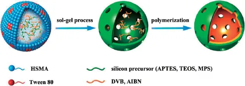 Further, for preparing a robust shell with hard templates (SiO2 particles) free, we proposed another strategy for preparing porous Janus hollow spheres based on the sol–gel process at the emulsion interface and polymer grafting onto the interior surface (Fig. 4) [12]. The binary surfactants instead of SiO2 particles are used to make the transverse channels across the shell due to phase separation. The resulting Janus hollow spheres are further functionalized by growing responsive polymers onto the interior surface for easy loading of the desired materials. In addition, magnetic nanoparticles can be integrated into the composite shell to make the Janus spheres work under a magnetic field.