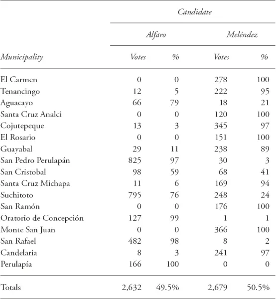 Complete returns from the 1895 election provide a nationwide view of the monopolization of polling stations and demonstrate that what transpired in Sonsonate was typical. Voting occurred in all 248 municipalities in the nation. In 176 of these municipalities the victorious candidate won with more than 95 percent of the vote, including 96 municipalities where voting was unanimous. Alfaroâs network dominated seven of the fourteen departments (La Paz, UsulutĂĄn, San Miguel, La UniĂłn, MorazĂĄn, AhuachapĂĄn, and Sonsonate), winning them by a combined total of 20,320 to 2,574. To his detriment, MelĂ©ndez controlled only two departments by comparable margins, San Vicente and Cabañas: 4,931 votes to 600. In the remaining five departments (CuscatlĂĄn, Chalatenango, Santa Ana, San Salvador, and La Libertad) the two candidates split the departmentwide vote evenly, but voting at the municipal level was starkly divided. CuscatlĂĄn Department provides a clear example. Alfaro and MelĂ©ndez each took 50 percent of the vote, but in thirteen of the departmentâs seventeen municipalities the victorious candidate won with more than 94 percent of the votes, including six municipalities that were decided by unanimity (see table 1.1). A similar result is found in Chalatenango Department, where Alfaro received just over 4,000 votes and MelĂ©ndez just under 3,000, a relatively even split. In twenty-seven of Chalatenangoâs thirty-five municipalities victory was attained with at least 91 percent of the votes. Unfortunately, the historical record does not contain detailed letters from affiliates in other departments comparable to Riveraâs correspondence from Sonsonate. It can be safely assumed that in each of those departments, men like Rivera were diligently working on the behalf of Alfaro or MelĂ©ndez in the same way that Rivera was doing in Sonsonate. When Alfaro assumed the office of vice president, he knew that he owed those departmental bosses something for their support, or that he had burned through some of the political capital that he had accrued previously.