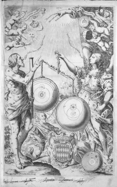 On the right side of the scales is not a representation of the “geocentric hypothesis,” the ancient world system of Ptolemy (who wrote the original Almagest) and Aristotle, in which Earth is in the center of everything, and everything circles around Earth. Galileo’s famous Dialogue of 1632 concerned “the two chief world systems: Ptolemaic and Copernican.” But in the New Almagest, the Ptolemaic system is not what is being weighed against the Copernican system. In Riccioli’s frontispiece, the Ptolemaic world system is sitting off to the side, on the ground, looking a little forlorn. Clearly the telescopic discoveries shown above the scales, especially the phases of Venus and Mercury (which proved those bodies circle the Sun), have removed that ancient system from Riccioli’s consideration.