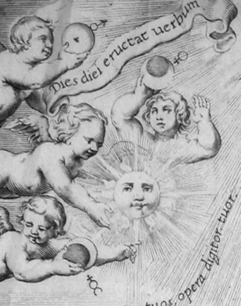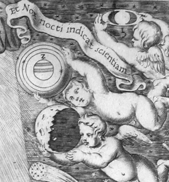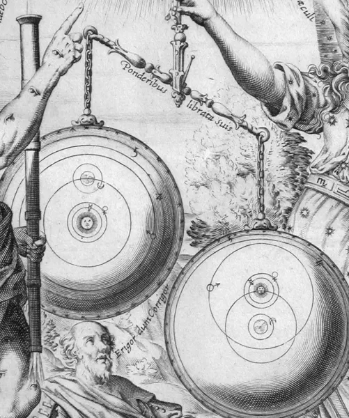 Yet the main feature of the frontispiece was a set of scales, being held by Urania, the Greek muse of astronomy, while the many-eyed Argus, holding a telescope, looked on (fig. 1.3). The modern reader who studies the frontispiece will immediately recognize, on the left side of the scales, a representation of the world system of Nicolaus Copernicus (1473–1543)—the “heliocentric hypothesis.” There is the Sun, in the middle of everything, with planets circling around it, and the Moon circling the third planet from the Sun.