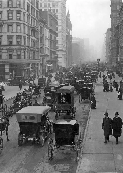 From the 1890s on, motorcars mixed with horse-drawn vehicles, their noisy engines spewing fumes, their Klaxons blaring warnings to all. The mayoral campaign of 1903 highlighted the myriad nuisances. The new Fusion Party, which sought to oust the corrupt Tammany political machine from office, promised to repair “asphalt pavements found in very poor order,” to remove snow from the streets in a timely fashion, to rid the streets of rubbish, and to attend to “the vexatious problems of street traffic.” Danger lurked around every corner, the Herald reported, citing the threats of loitering “roughs” and “loafers” and alarming readers with accounts of smashed carriages and runaway horses. At every curb, mounds of ripe horse manure awaited the misstep of the custom-fitted boot or shoe.