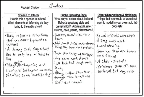 It was important to remind students that their speeches would be heard and not read, so students needed to understand the difference between writing an informative essay and crafting an informative podcast. We took a break during the drafting stage to examine the āmovesā the Radiolab hosts made to keep listeners engaged and informed.