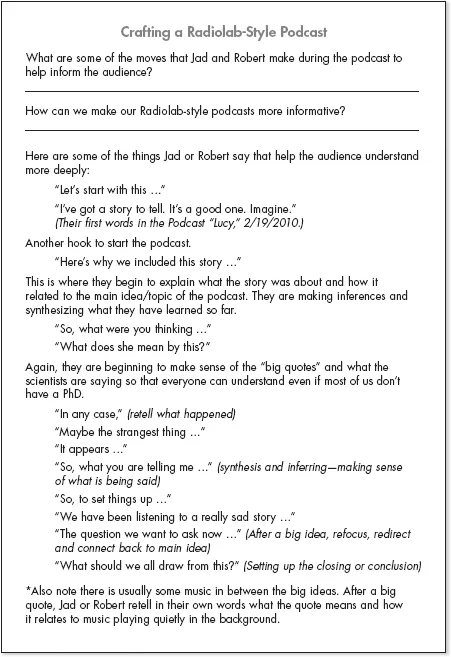 During the first two days of the unit, students were to listen to one of two podcasts I had selected and complete an analysis worksheet (Figure 11.1). Next, they listened to a podcast of their own choice from the archives available on the Radiolab website.