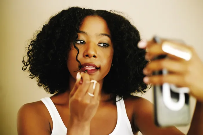 Figure 1.1A black millennial woman applying lipstick.