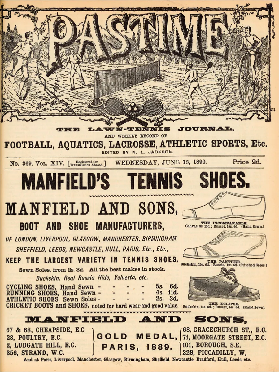 In spring 1889, a reporter from the London sports weekly, Pastime, toured the âhuge warehouseâ of William Hickson and Sons, a Northamptonshire shoe manufacturer. There he was shown âlawn-tennis shoes in endless variety ready for the coming season.â This was not unusual. The following year, at Manfield and Sons, he was almost overwhelmed: a âdescriptive catalogue of all the varieties of lawn-tennis shoes to be found at the showrooms of this firm would more than exhaust the space at disposal,â he wrote. âEvery kind of rubber sole is united with canvas, buckskin, calf, and Russia [leather], in combinations innumerable, ranging in price from under three shillings to nearly ten times that amount.â Competition between manufacturers was fierce. As Pastime had noted in 1888, â[y]ear by year the task of visiting show-rooms and manufactories becomes more laborious, owing to the great number of makers that are continually entering the field.â1 Rival firms fought for consumersâ business, driving sports shoemaking to new heights.