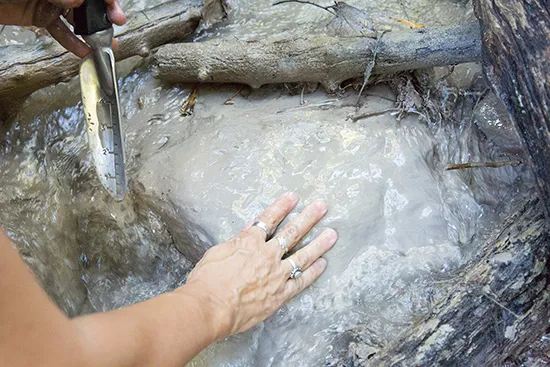 As we walk on the smooth clay floor on a warm autumn day, we feel between our toes, feet and ankles the cold, clear water running from the nearby spring. With two large plastic pails, a hiking knife and an array of small metal garden tools (one hand fork, two hand transplanters, three hand cultivators and four hand trowels), we dig into the Komoka creek clay floor. As we dig, we wonder how we might care differently for clays that do not arrive in the classroom wrapped in thick plastic bags. Might this clay remind us of its histories, of its minerals, of the war declared on the land on which we stand?14