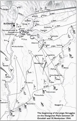 Although the Soviet units succeeded in occupying Debrecen on 20 October 1944, they were unable to fulfil their aim of encircling the German 8th Army and the Hungarian 1st and 2nd Armies stationed in Transylvania and the Carpathians. In addition, the 4th Ukrainian Front under Major-General Ivan Yefremovich Petrov, which should have closed the circle from the north, had made hardly any headway. Thus the German Army Group South succeeded in extricating its troops. After Regent Miklós Horthy’s failed attempt of 15 October to break away from Germany and agree a separate peace with the Soviets, the panzer units that had so far been tied down in the border area added their strength to the German front. By 20 October, the Germans had lost only 133 tanks, while the losses of the Soviets amounted to 500 – more than 70 per cent of their strength.1 By the end of October, the German panzer divisions had encircled General Issa Aleksandrevich Pliev’s mechanised cavalry units in the Nyíregyháza region, and the Soviet troops were only able to break out with heavy losses.