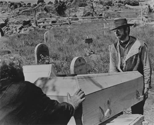The Stranger in town (Clint Eastwood) and Silvanito the bartender (Pepe Calvo) in familiar surroundings. Sergio Leoneâs A Fistful of Dollars (1964).