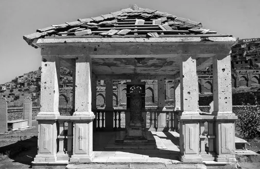 After the fighting ended, large sections of Kabul lay in ruins and the monuments and grand buildings that once graced its streets were in large part no more. The National Museum, once home to some of the Silk Road’s greatest treasures, stood wrecked and roofless, its contents looted or destroyed.2 Above it all, on the slopes of a hill called Sher-Darwaza, the great Mughal emperor, Babur, lay in eternal repose in the gardens that he loved so much. After Babur’s death in 1530 his remains were brought to Kabul from Agra in fulfilment of his instructions, and he was laid to rest in a simple tomb. The fighting of the 1990s did not spare the tomb or the gardens and its appearance in 2000 was a metaphor on the impermanence of kingship and power (Figure 3).