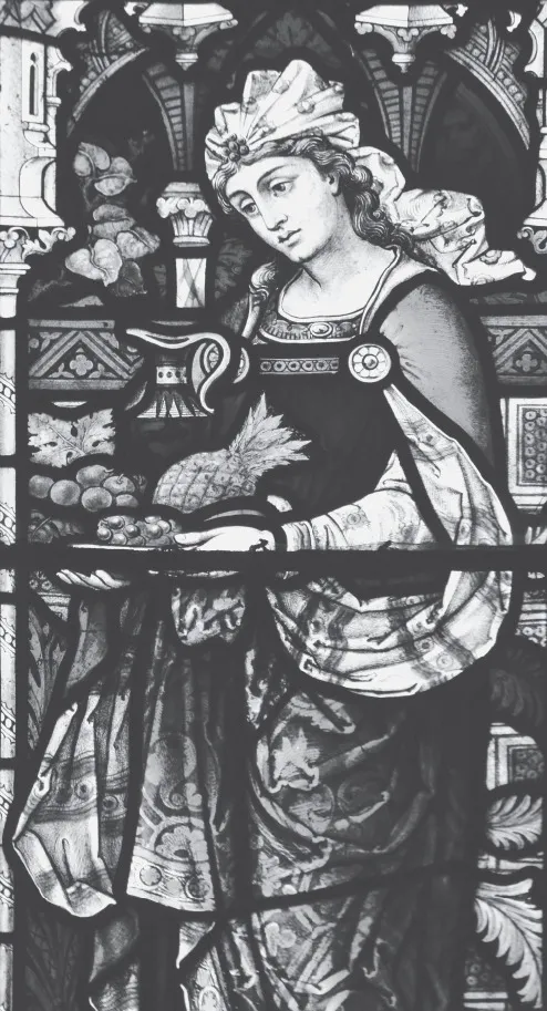 These examples feature men, but in fact Acts of Mercy windows are one of the few types in which women predominate and are notably active. They embody many Christian virtues, and even though their gendered ideals of piety may no longer be acceptable, these windows can be fascinating period pieces. At St Mary, Wirksworth, the gloriously sumptuous 1883 window designed by T. W. Camm of Smethwick is a detailed evocation of charity as performed by gracious, well-to-do ladies. The scenes, with many lovely domestic details (potted fern, wicker basket of blue grapes and vine leaves, ruby-and-white flashed-glass tumbler), must have been a long way from the stark reality of the local Derbyshire mill workers’ and miners’ lives, and very much exemplify and embody the Victorian social hierarchy of philanthropy. It also contains one fascinating piece of local history, in the shape of a pineapple on a platter of hothouse fruit carried by the woman who is feeding the hungry: Joseph Paxton’s pineries at nearby Chatsworth House were some of the finest in Britain and the pineapples grown there were renowned in the nineteenth century. To give away a pineapple must have been the height of charity for the well-to-do of Wirksworth.