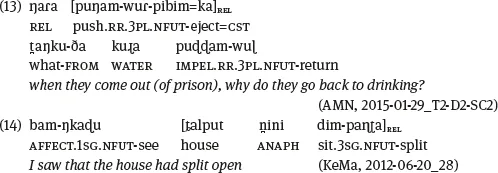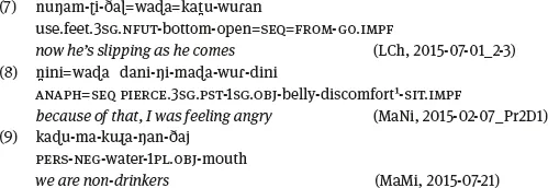 As mentioned in the previous section, Murrinhpatha words may have elaborate morphological structure. This is most common for verbs (7, 8), though nouns may also exhibit substantial complexity, especially when they play the predicating role in a clause (9). The details of these morphological structures are the main subject matter of this book.