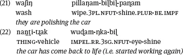 The finite verb stems vary from those that make a clear lexico-semantic contribution to predicates, to those that contribute more grammaticalised valency or aktionsart cont...