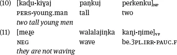 This book is not a general grammar of Murrinhpatha, but rather focuses on a more detailed analysis of morphology, phonology, and the interaction between the two. There is some discussion of phrase constituency (in particular, noun phrases and verb phrases), but only inasmuch as these are necessary to understand word structure (§4.3), or to define the domain of attachment for bound morphology (§7). ‘Higher level’ topics in syntax, semantics and pragmatics are not addressed (but see e.g. Blythe, 2009; Nordlinger, 2011b; Walsh, 1976). However, to provide some context as to how Murrinhpatha words fit into sentences, I here provide a brief grammatical sketch of both word and sentence phenomena.