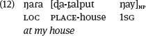 A single preposition /ŋaɾa/ can introduce either a locative NP (12) or a relative clause (13), although relative clause relations are more often simply implied by parataxis (14) (Walsh, 1976, p. 287ff.).