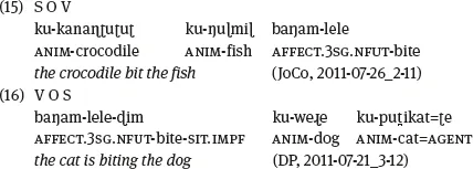 Other than these NP, VP and PP/REL structures, no other configurational phrase structures have been observed in Murrinhpatha. SOV and SV are the most frequent word orders for uncontextualised declarative sentences (i.e. not taking into account discursive context), though research on this topic is at an early stage (Mujkic, 2013, p. 56; Walsh, 1976, p. 276ff.). Other orders are also acceptable (15, 16), and in practice one or more arguments are generally elided, or dislocated into separate intonational units.