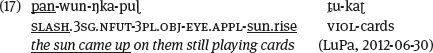 | (6) | púɾu-ŋime | ‘let’s go!’ |