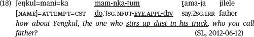 While (16) uses an agentive enclitic to distinguish thematic roles (see §7.3 for other such case markers), explicit NP role marking of this type is in fact rather rare. It is more common for sentences to use overt nominal arguments for only a subset of the participants, and for their roles to be contextually understood, as in (15) above. Only high-animacy participants (humans, and sometimes animals) are marked on the verb using pronominal morphology. But verbs have a tendency to specify not just events but entities, sometimes obviating the need for nominal arguments (17, 18).