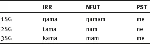 For verbs there are 39 finite verb stems, each of which appears in a paradigm of 42 inflected forms. The inflectional patterns of these paradigms are highly irregular. Fragments of two verb stem paradigms are shown in Tables 1.1 and 1.2.