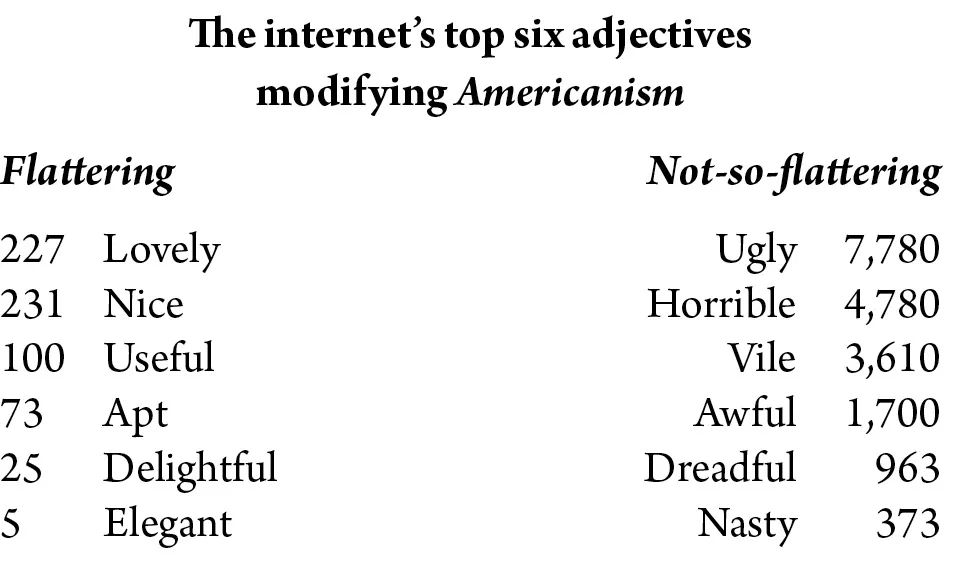 We can actually quantify the horror that American English arouses. After using a thesaurus in order to find adjectives meaning âgoodâ, âusefulâ, âbadâ, and âuselessâ, I searched the internet for the phrase a(n) _____ Americanism, inserting the synonyms into the blank. Iâm happy to report that on that particular day the worldwide web knew of 227 lovely Americanisms, 73 apt ones, and even 5 elegant ones. But the top six not-so-flattering adjectives are slightly more numerous. (Iâve lived in England long enough to have mastered the ironic understatement.)