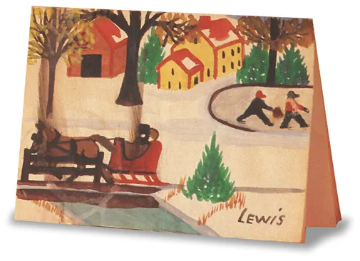 Maud Lewis has become one of Canada's favourite folk artists, and her buoyant winter pictures of nature, pets, farm animals, and people at work and play are among her most charming. Her hands were twisted with arthritis, but Maud earned her living by painting Christmas cards and pictures and selling them from her tiny, gaily painted one-room house beside the highway near Digby, Nova Scotia.