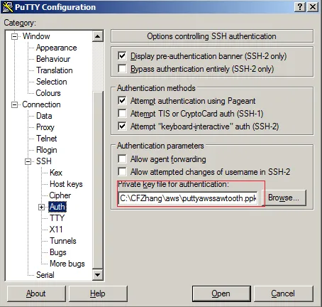 - Run PuTTy and specify the private key file for PuTTy in Connection | SSH| Auth. Log in as ubuntu to the Sawtooth AWS instance:
