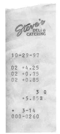 WHAT CAN DOCUMENTS TEACH US? Let’s begin by looking at one, close up. The one I have in mind is a cash register receipt, a small strip of paper, 1% inches in width and approximately 4¼ inches in length, marked in light blue ink. At the top it reads “Steve’s Deli & Catering.” Immediately below is a sequence of numbers, 10-29-97, and near the bottom is a decimal value, 5.85. From the look of it, someone bought something from Steves Deli on October 29, 1997, and paid $5.85 for it.