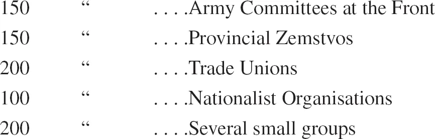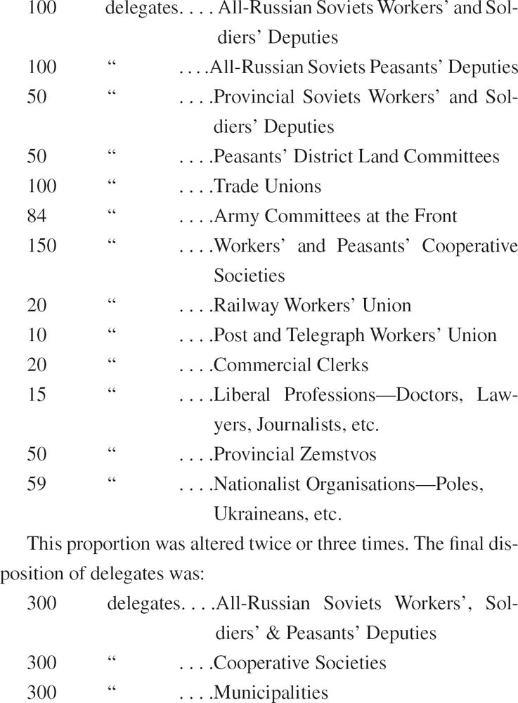 When the Democratic Conference was first proposed to Kerensky, he suggested an assembly of all the elements in the nationā€”ā€the live forces,ā€ as he called them—including bankers, manufacturers, land-owners, and representatives of the Cadet party. The Soviet refused, and drew up the following table of representation, which Kerensky agreed to: