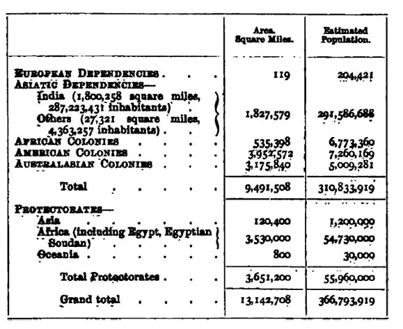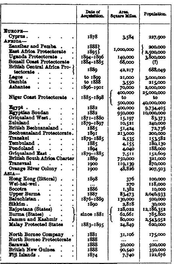 The following comparative table of colonisation, compiled from the âStatesmanâs Year-bookâ for 1900 by Mr. H. C. Morris,7 marks the present expansion of the political control of Western nations:â