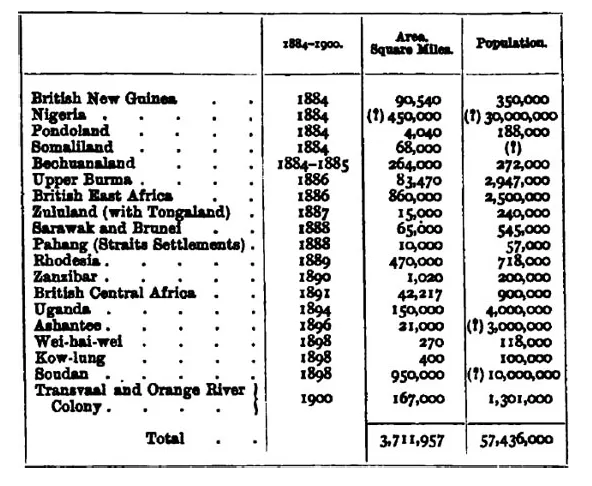 Though, for convenience, the year 1870 has been taken as indicative of the beginning of a conscious policy of Imperialism, it will be evident that the movement did not attain its full impetus until the middle of the eighties. The vast increase of territory, and the method of wholesale partition which assigned to us great tracts of African land, may be dated from about 1884. Within fifteen years some three and three-quarter millions of square miles have been added to the British Empire.4