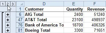 Strategy: If you look above and to the left of cell A1, you’ll see a series of three small numbers. These are the Group & Outline buttons. You can use them to collapse subtotaled data. If you click the small 2 button, you will see just the customer totals.