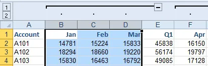 Below, select the entire column for Jan, Feb, and Mar and click the Group icon on the Data tab. Excel will group those 3 columns and assumes the next column is the summary of those columns.