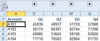 Repeat this to group April, May, and June into Q2; July, August, September into Q3; and October, November, and December into Q4. The result is that you can quickly toggle from monthly to quarterly views by using the 1 or 2 buttons.